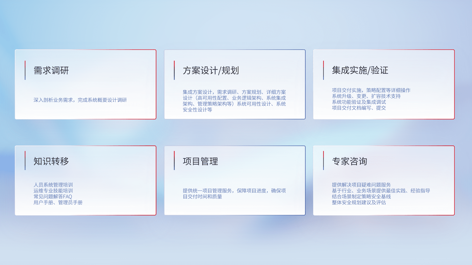 针对客户行业特性,,,将宏观的安全战略和需求,,,,通过专业的交付服务,,实现项目落地,,为客户提供标准规范的集成交付服务。。。